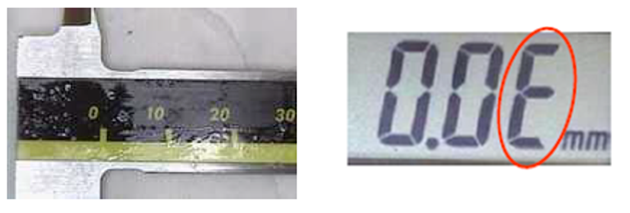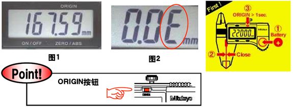 三豐卡尺更換電池后,顯示器可能會(huì)出現(xiàn)任意數(shù)值(如圖1),如不進(jìn)行原點(diǎn)設(shè)置而直接使用的話,會(huì)出現(xiàn)圖2中末位“E”的報(bào)錯(cuò)現(xiàn)象。